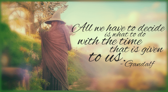 “I wish it need not have happened in my time,’ said Frodo. ‘So do I,’ said Gandalf, ‘and so do all who live to see such times. But that is not for them to decide. All we have to decide is what to do with the time that is given us.”